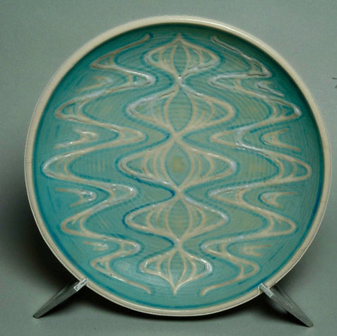 Grotell’s shapes were simple thrown cylinders and spheres that became vases or large plates like those in the Jeri L. Wolfson Collection. Patient and precise in her glazing, she knew the result she wanted and was not prone to accept accidents of the kiln. The wave pattern on the Untitled plate in the Jeri L Wolfson Collection is applied with control while also reflecting a confidence and freedom with the materials. The curved white glaze pattern crosses over the rings of the thrown form and the white rim serves as a frame for the whole. Grotell’s biographers report that she spent over a decade in search of the brilliant blue found on the Untitled charger in the Wolfson Collection. The ameba like wave pattern on this charger was one that she utilized often on bowls and plates. The shape is ebullient and implies movement and growth. The blue rim is in precise portion to the charger’s width.